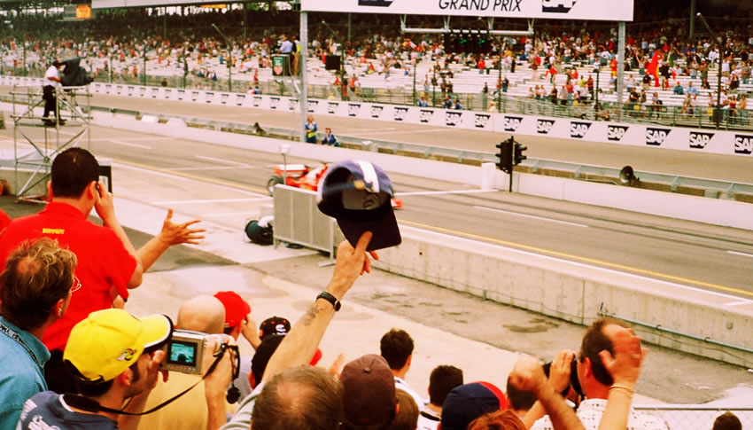 Schumacher leaving the pits. And some guy's hat covering the car. Great.