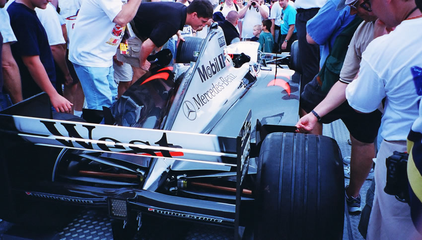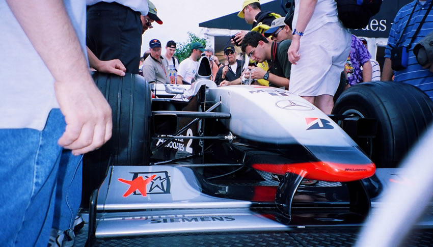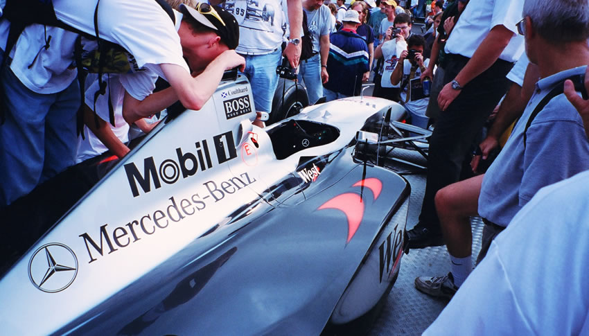 The 1999 McLaren MP 4/13 being mobbed by fans.