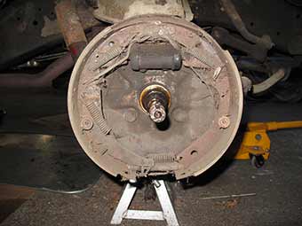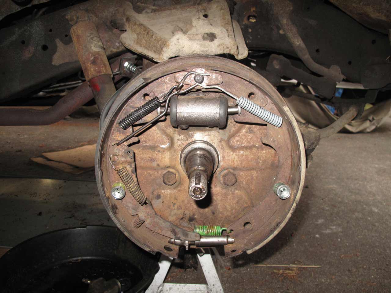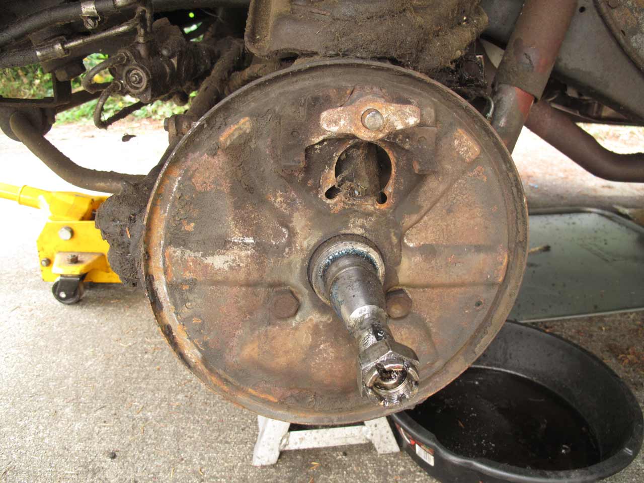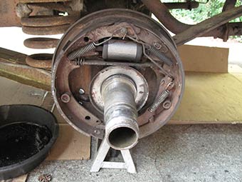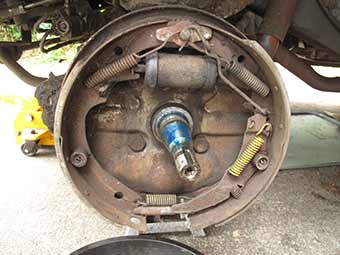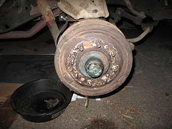 A little intimidating, the rear brake drum shows sign of a leaky seal and possibly leaking brake fluid.
